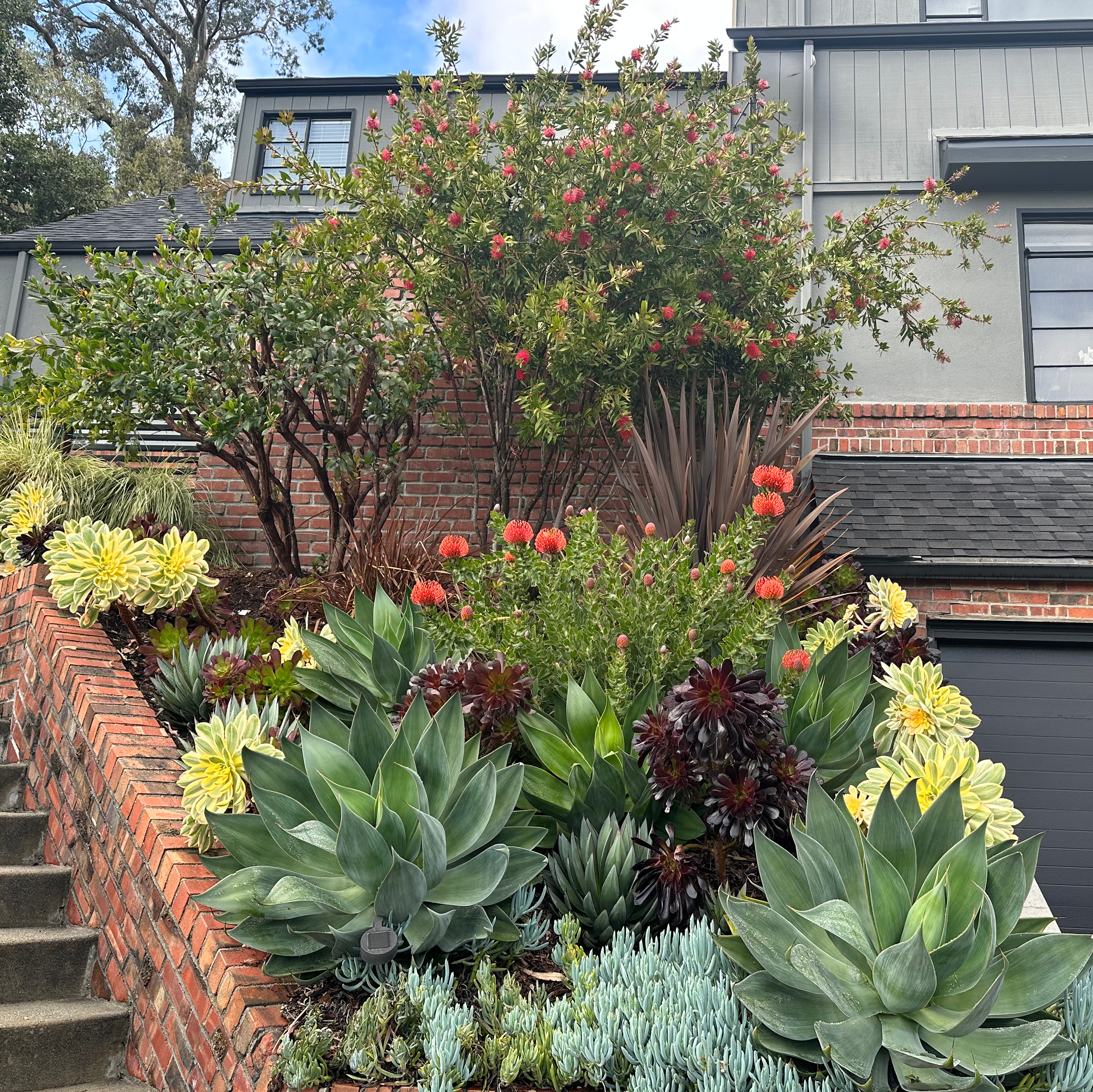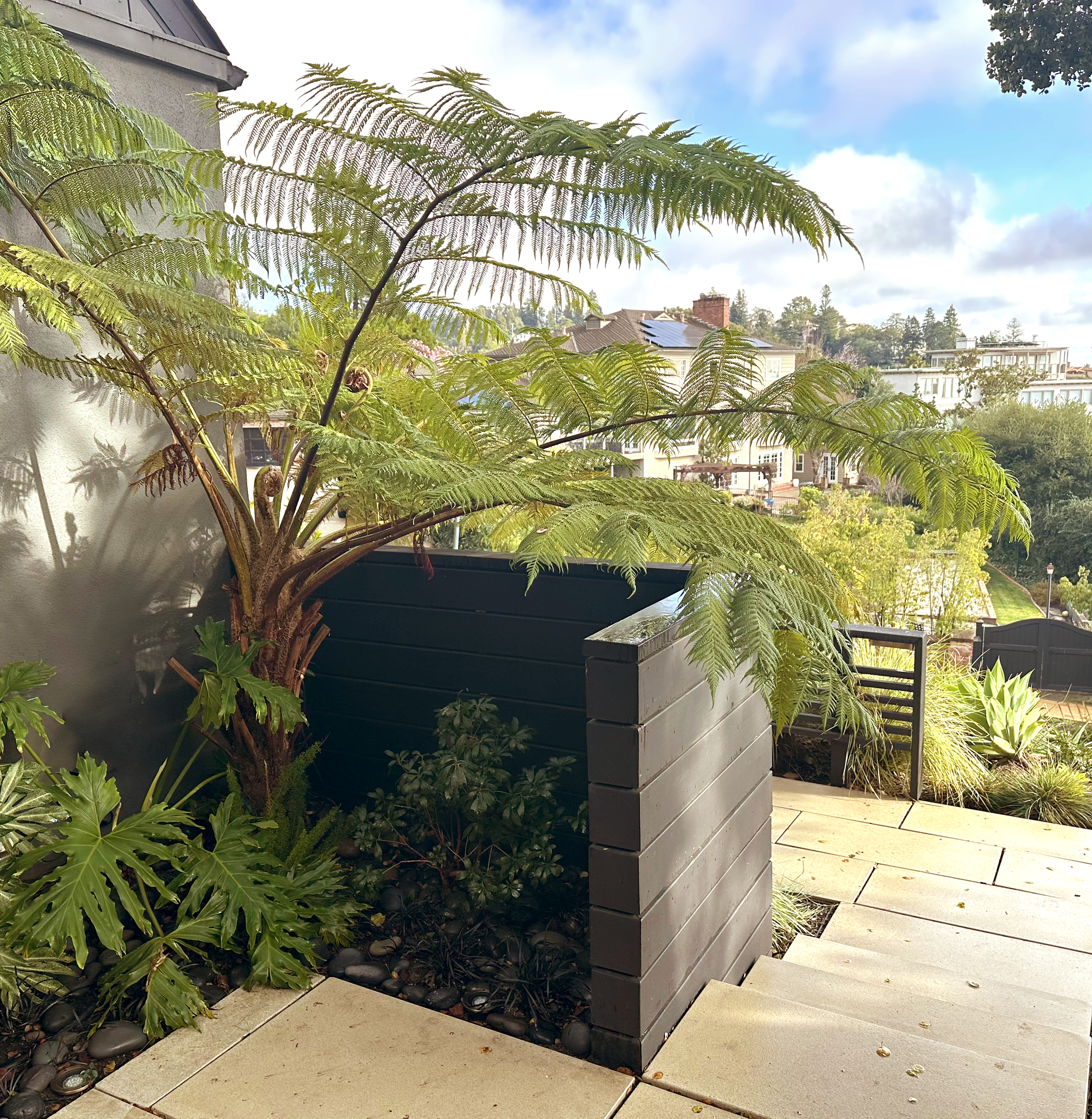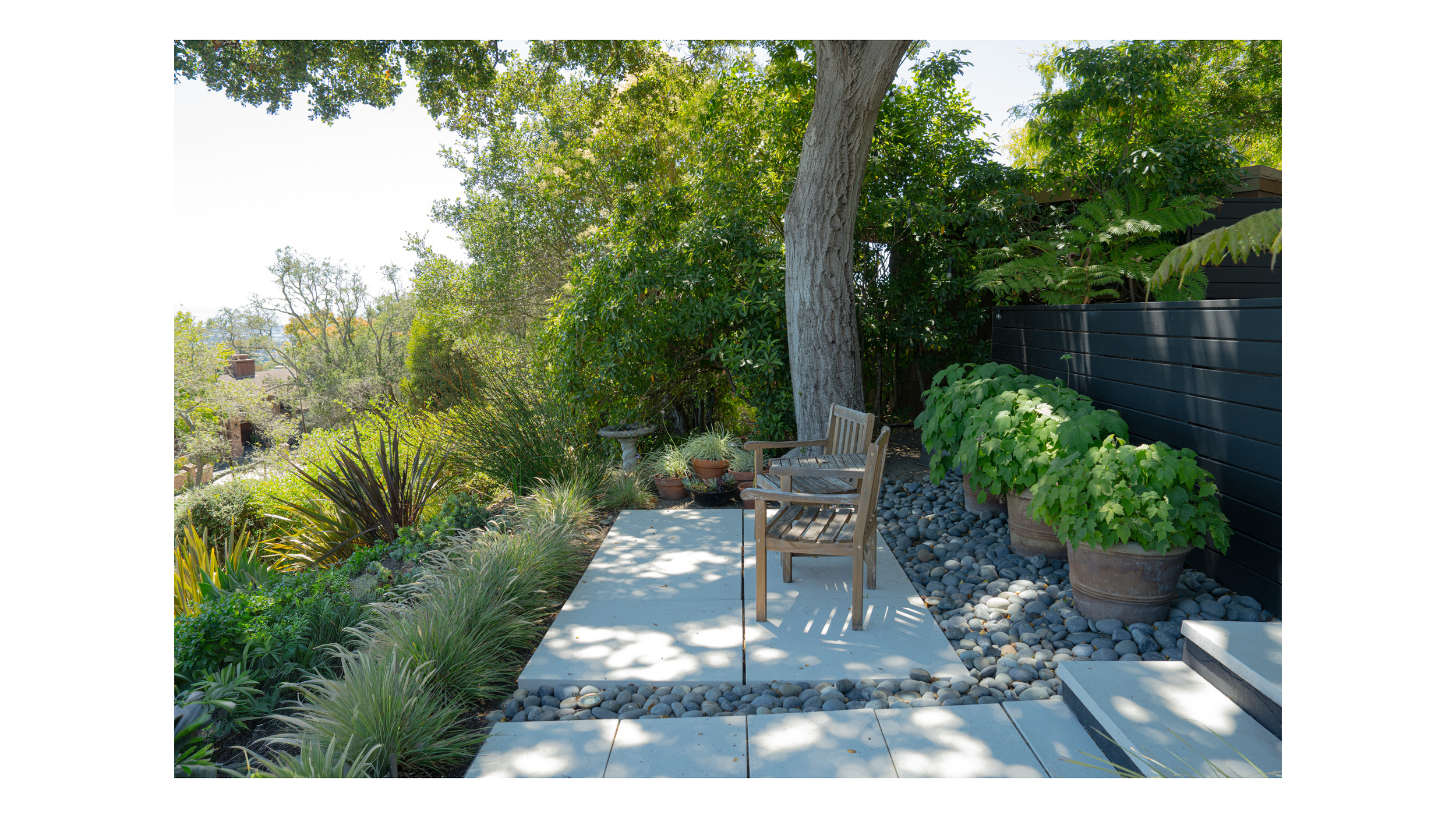 Somerset House embraces its steep hillside setting, transforming it into a seamless expression of California’s indoor–outdoor lifestyle. At its heart, an open-air living room rests beneath the broad canopy of a majestic coast live oak, with delicate tree ferns softening the edges in lacy green. The home’s once-traditional brick paving and walls have given way to sleek buff concrete pavers and a bold, black-painted wood fence—a modern frame that highlights the architecture. The slope beyond bursts with sculptural agave and striking succulents, their vivid foliage offering year-round color without dependence on blooms. Inspired by the artistry of a patchwork quilt, the landscape weaves texture, form, and color into a composition that is both contemporary and timeless.