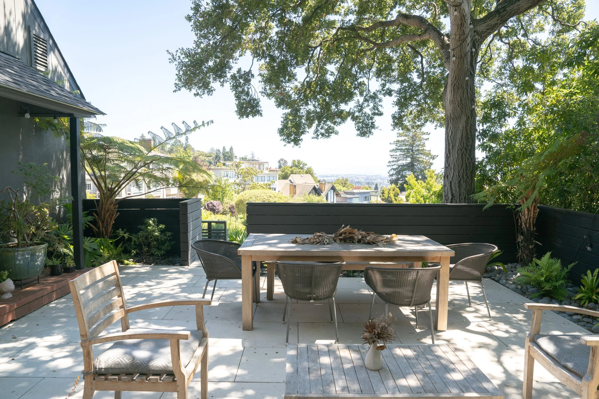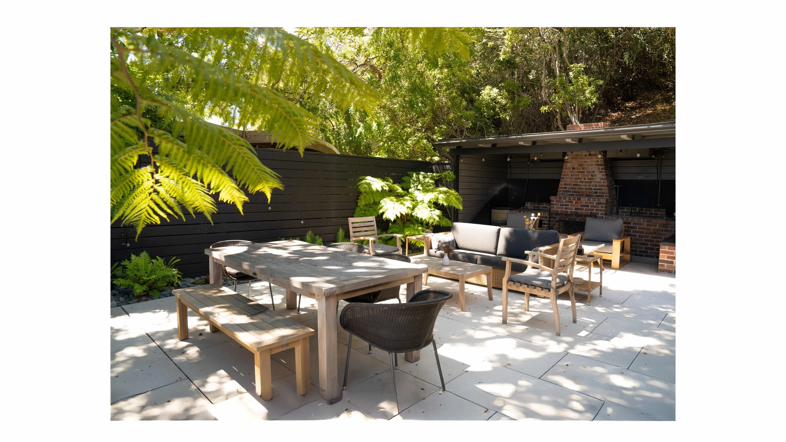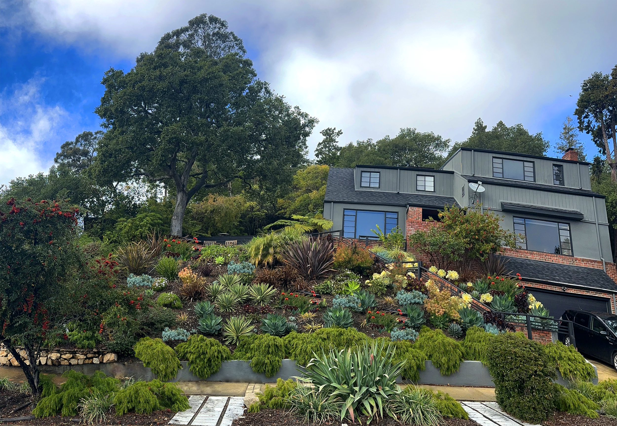 Somerset House embraces its steep hillside setting, transforming it into a seamless expression of California’s indoor–outdoor lifestyle. At its heart, an open-air living room rests beneath the broad canopy of a majestic coast live oak, with delicate tree ferns softening the edges in lacy green. The home’s once-traditional brick paving and walls have given way to sleek buff concrete pavers and a bold, black-painted wood fence—a modern frame that highlights the architecture. The slope beyond bursts with sculptural agave and striking succulents, their vivid foliage offering year-round color without dependence on blooms. Inspired by the artistry of a patchwork quilt, the landscape weaves texture, form, and color into a composition that is both contemporary and timeless.