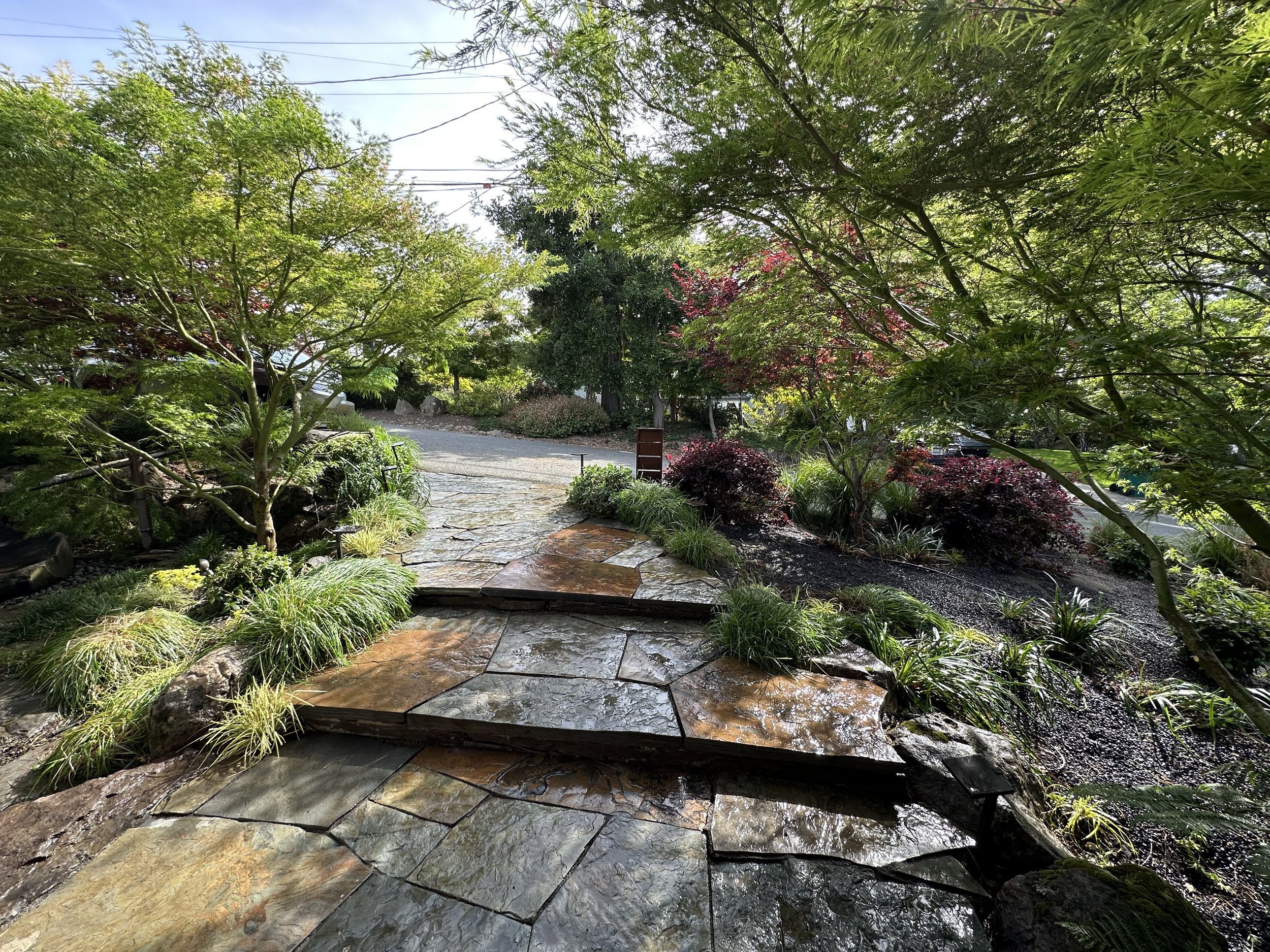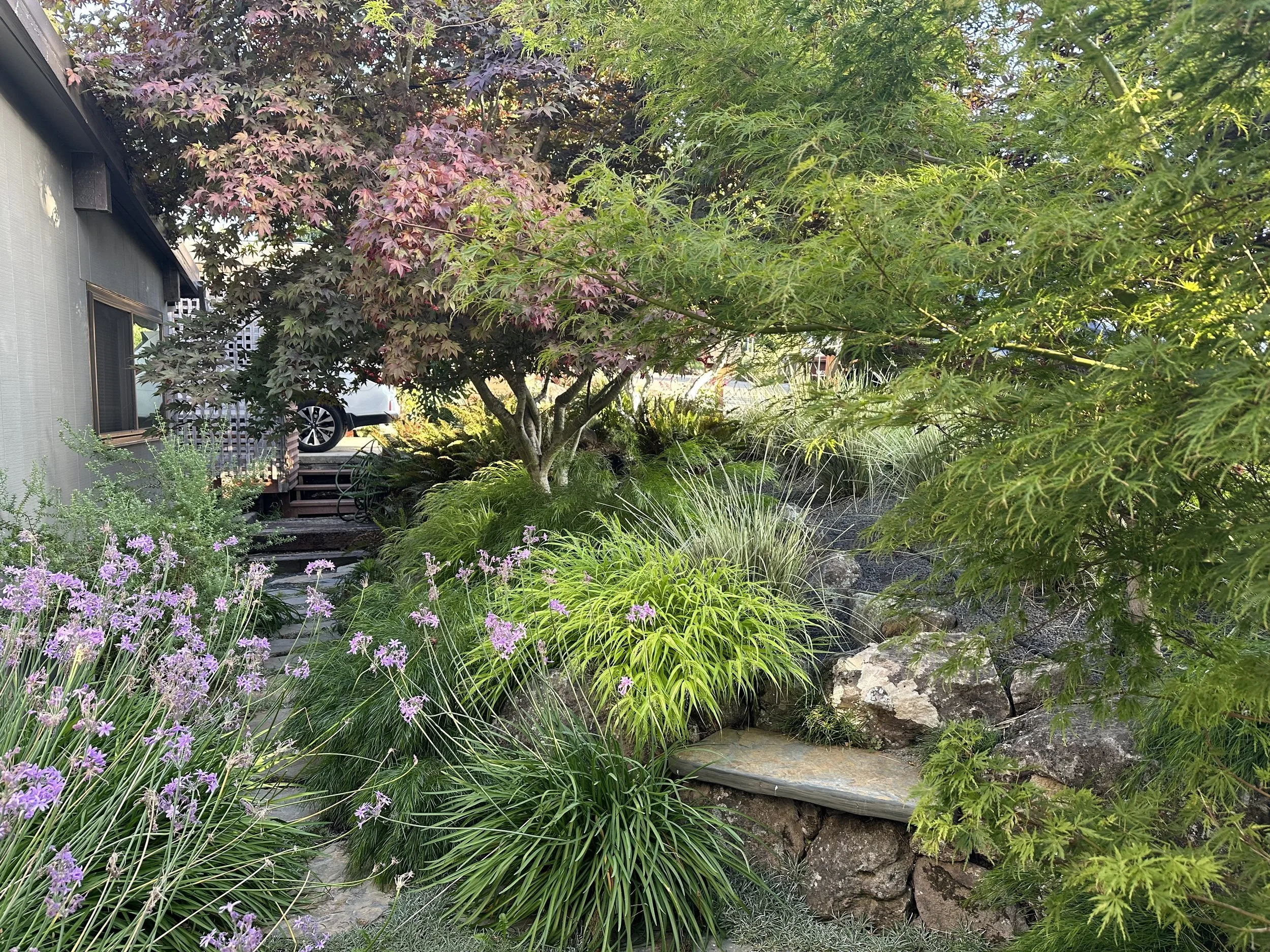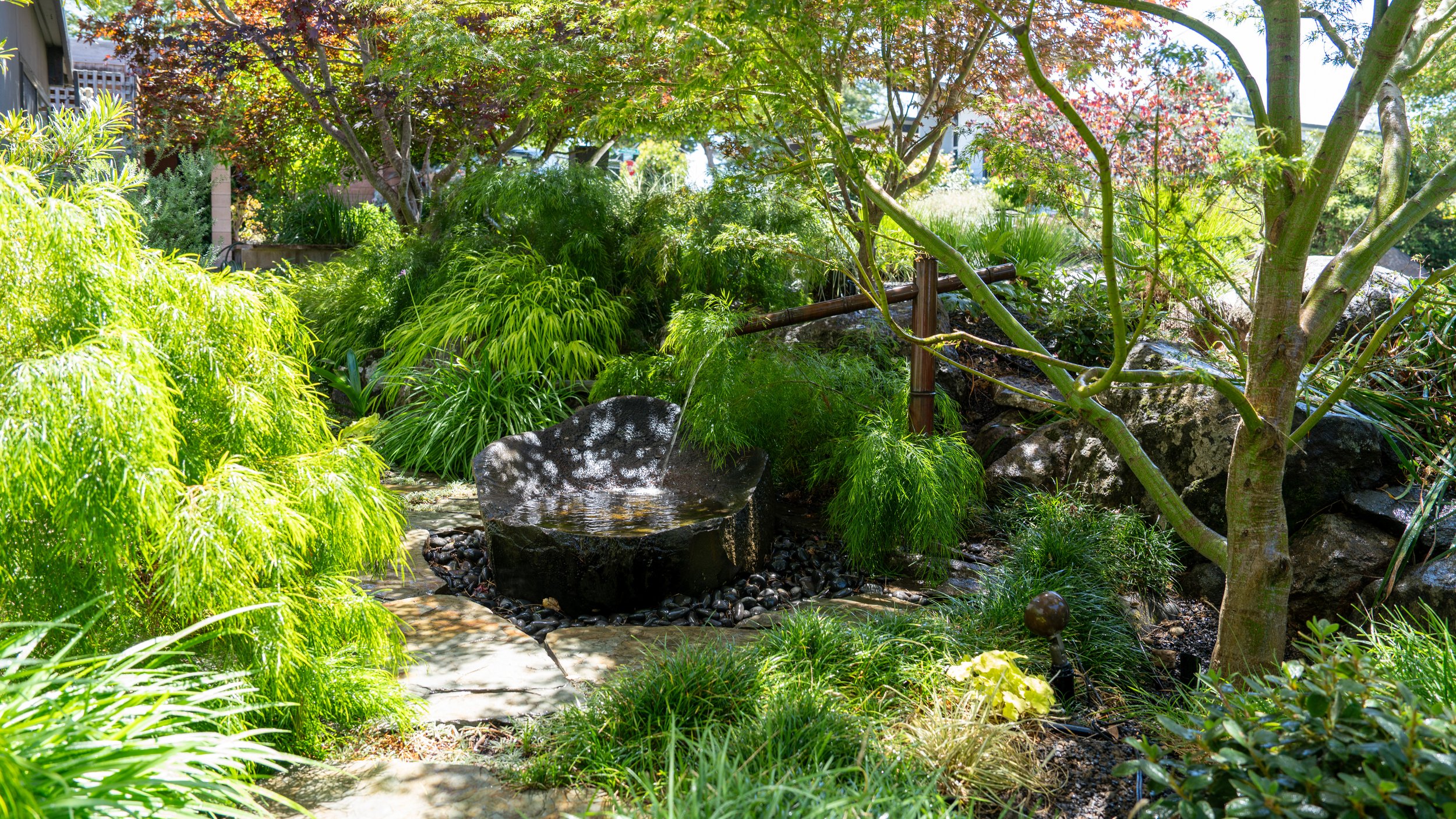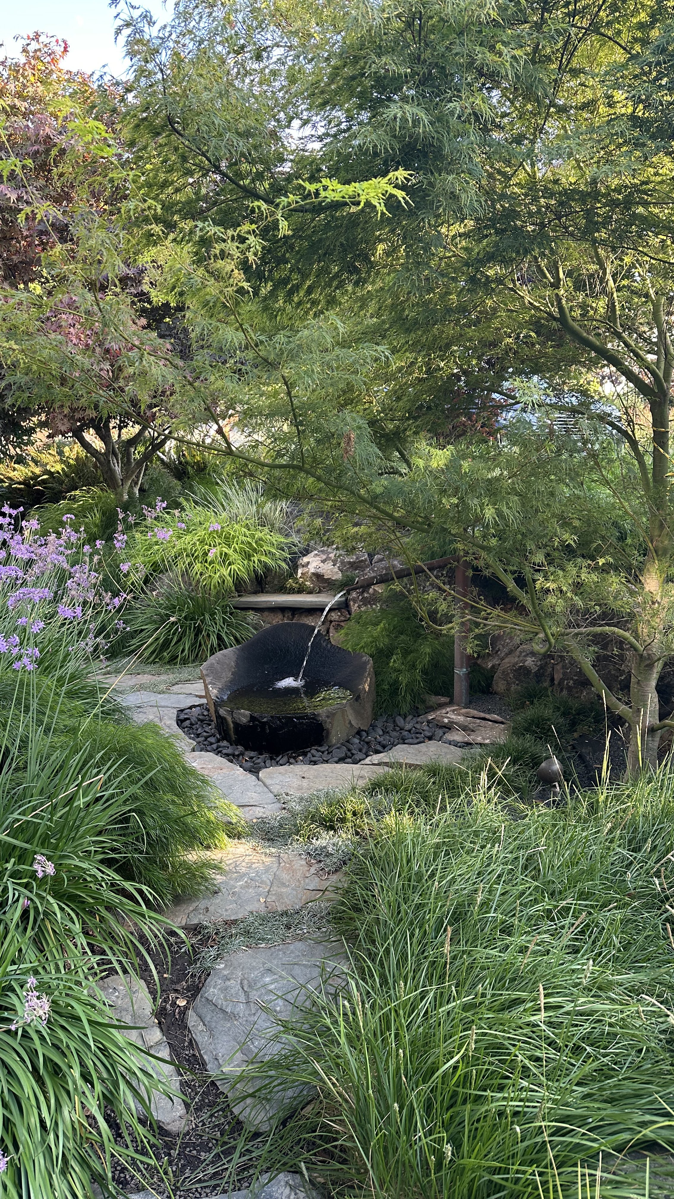 Stone & Stiil Waters blends Japanese aesthetics with California’s dry-climate sensibilities. Custom stone paving flows like a quiet path through time, anchored by weathered boulders which replaced old wood retaining walls. A concave basalt water feature is fed by a copper shishi-odoshi–inspired spout, while a reflecting pond is framed by moss-softened stones. Drought-tolerant plantings echo the textures and forms of traditional Japanese gardens, with intentionally placed Japanese maples adding elegance and seasonal color. A custom stone bench invites quiet reflection, completing this timeless balance of stone, water, and living beauty.