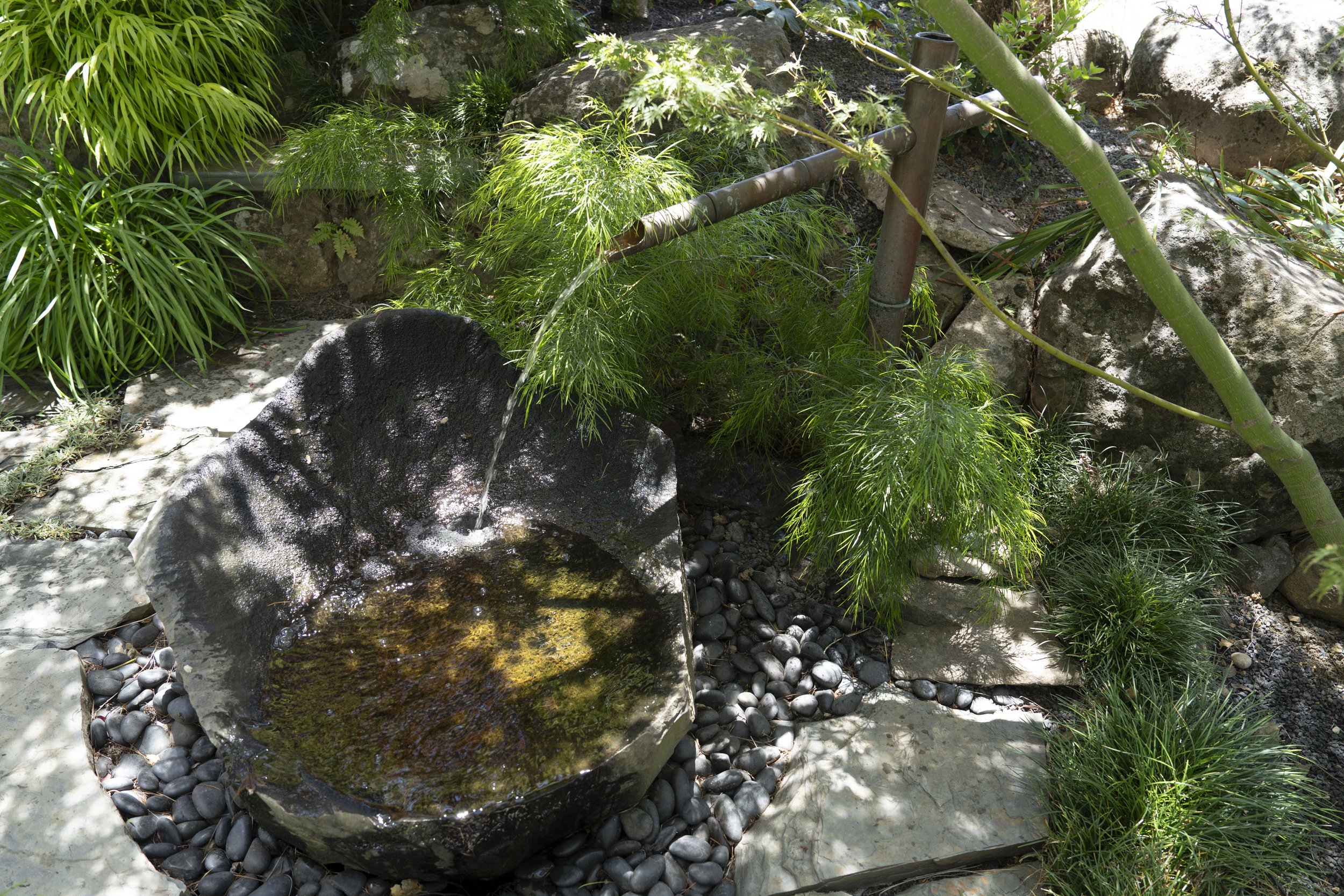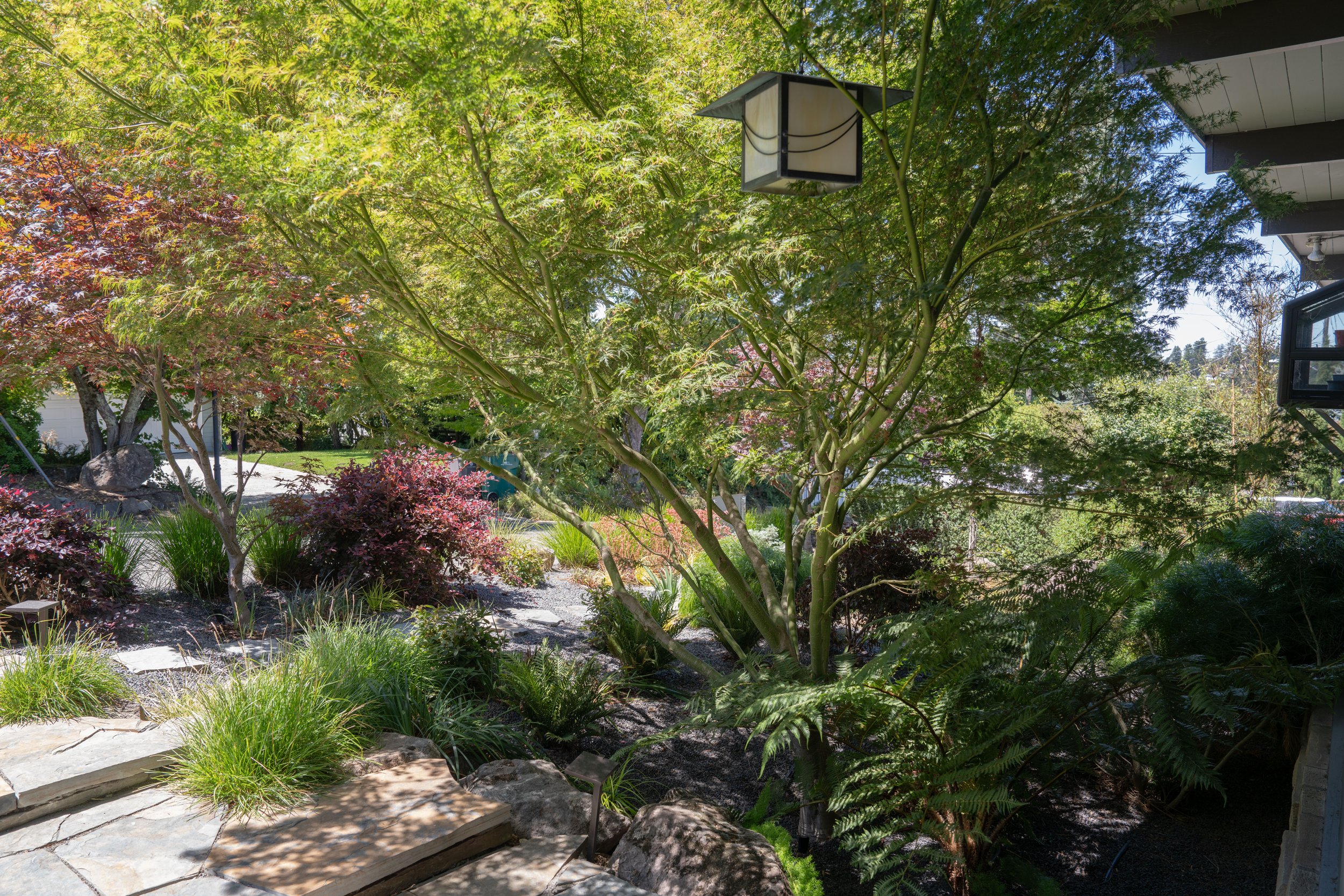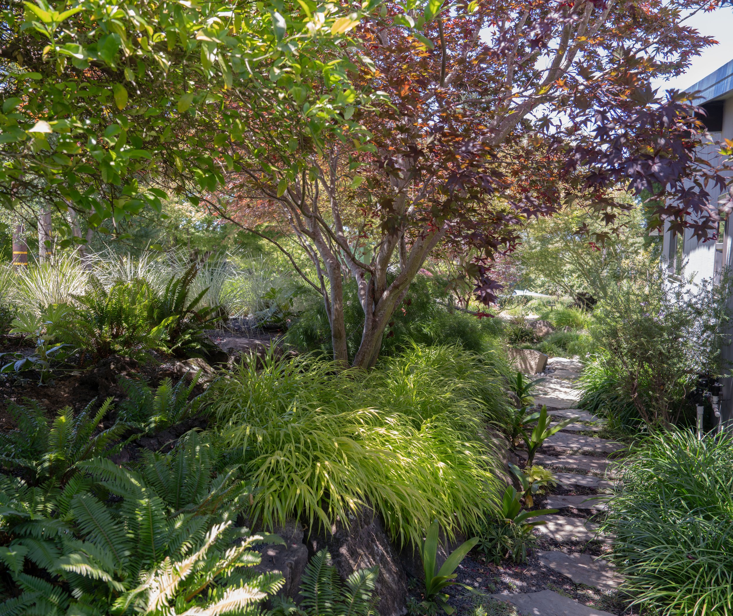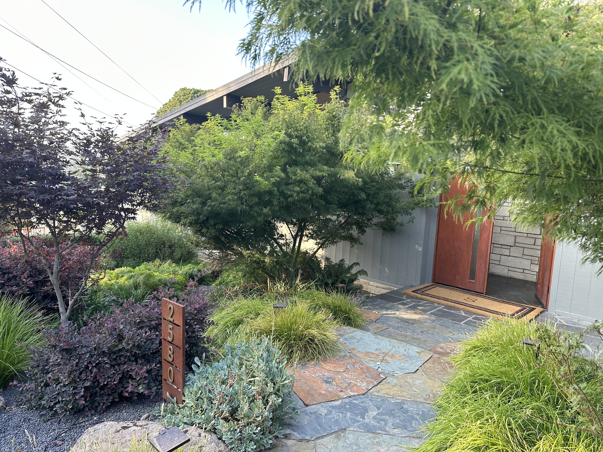 Stone & Stiil Waters blends Japanese aesthetics with California’s dry-climate sensibilities. Custom stone paving flows like a quiet path through time, anchored by weathered boulders which replaced old wood retaining walls. A concave basalt water feature is fed by a copper shishi-odoshi–inspired spout, while a reflecting pond is framed by moss-softened stones. Drought-tolerant plantings echo the textures and forms of traditional Japanese gardens, with intentionally placed Japanese maples adding elegance and seasonal color. A custom stone bench invites quiet reflection, completing this timeless balance of stone, water, and living beauty.