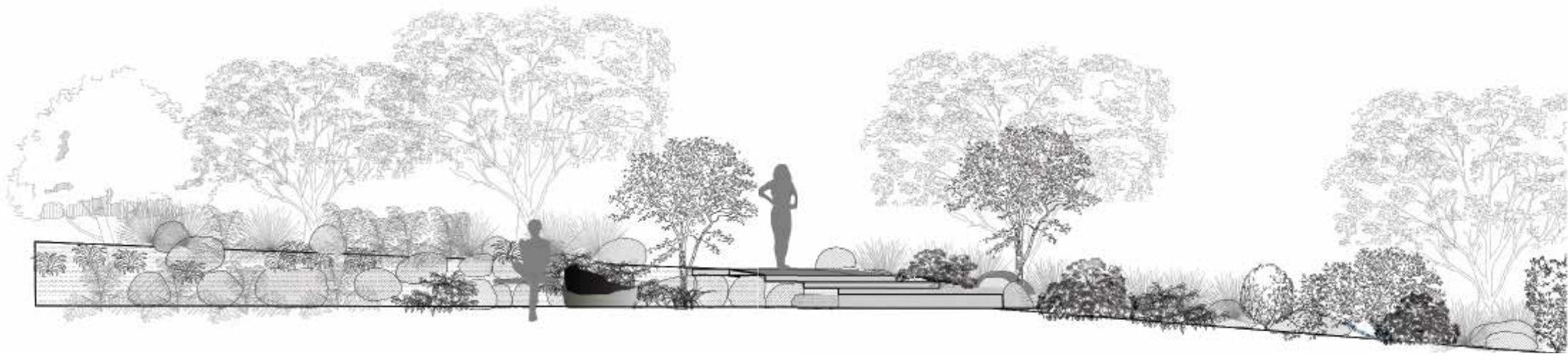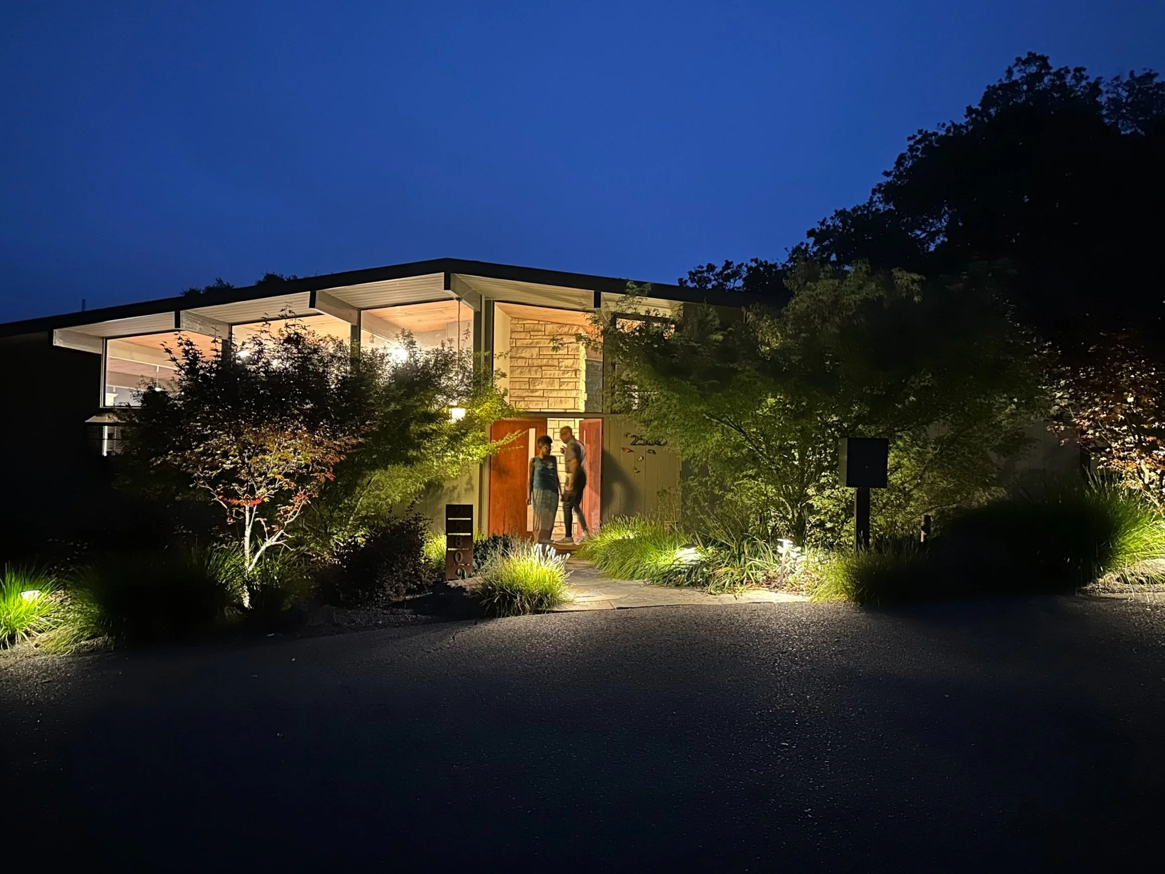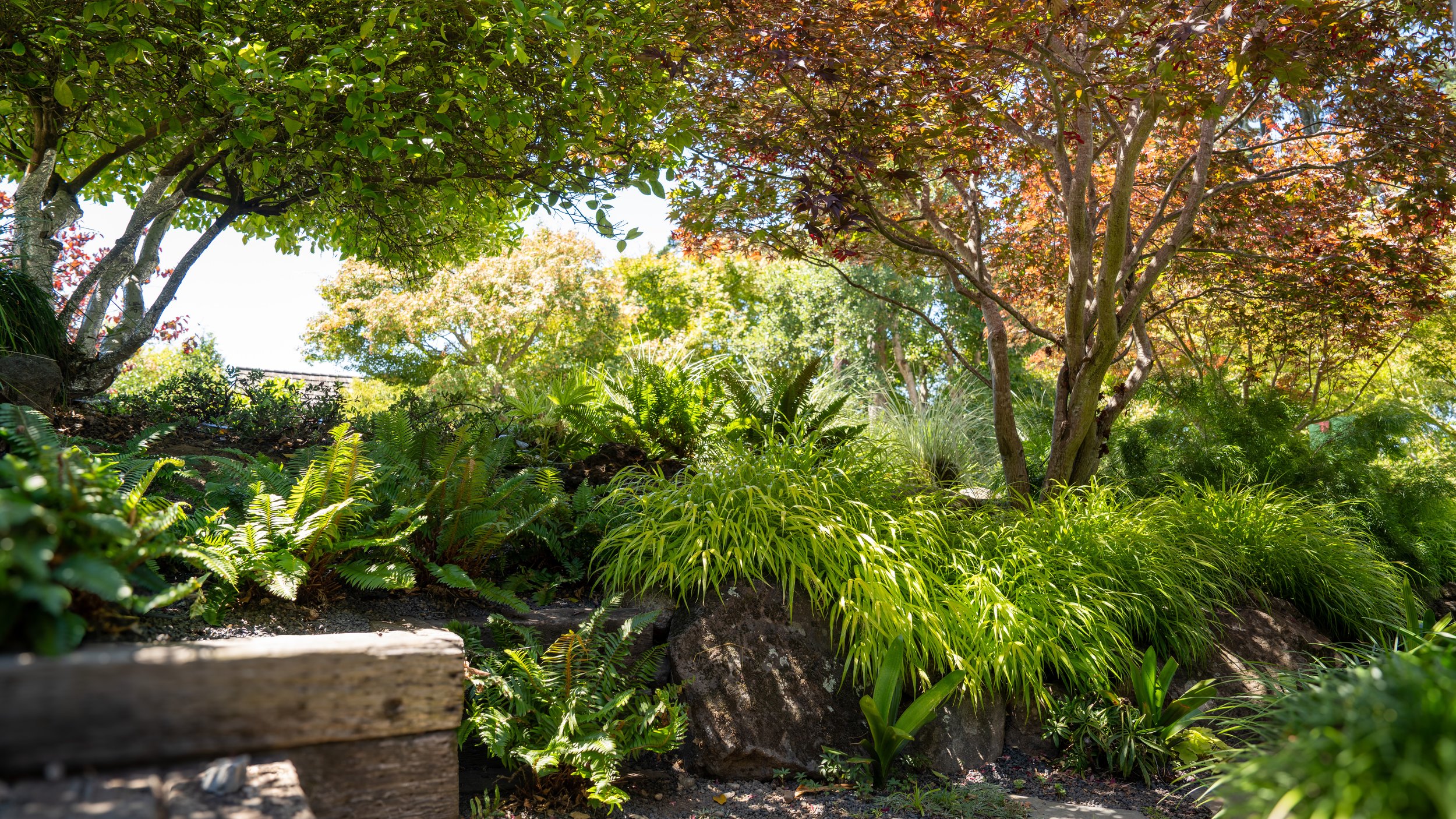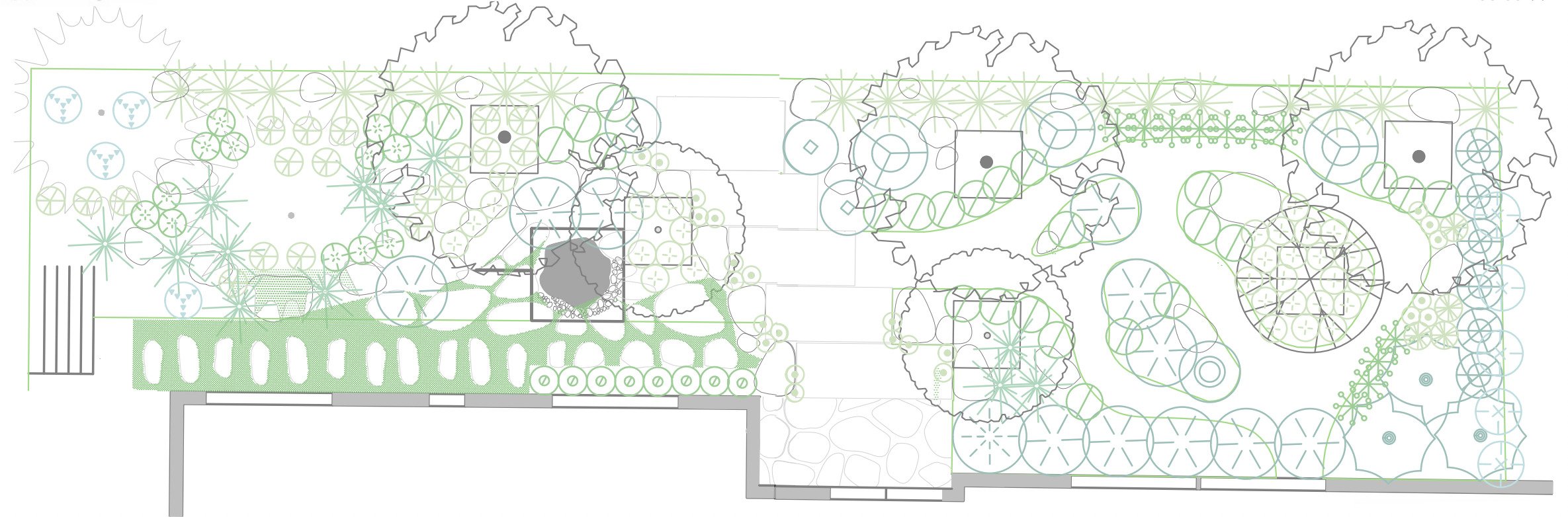 Stone & Stiil Waters blends Japanese aesthetics with California’s dry-climate sensibilities. Custom stone paving flows like a quiet path through time, anchored by weathered boulders which replaced old wood retaining walls. A concave basalt water feature is fed by a copper shishi-odoshi–inspired spout, while a reflecting pond is framed by moss-softened stones. Drought-tolerant plantings echo the textures and forms of traditional Japanese gardens, with intentionally placed Japanese maples adding elegance and seasonal color. A custom stone bench invites quiet reflection, completing this timeless balance of stone, water, and living beauty.
